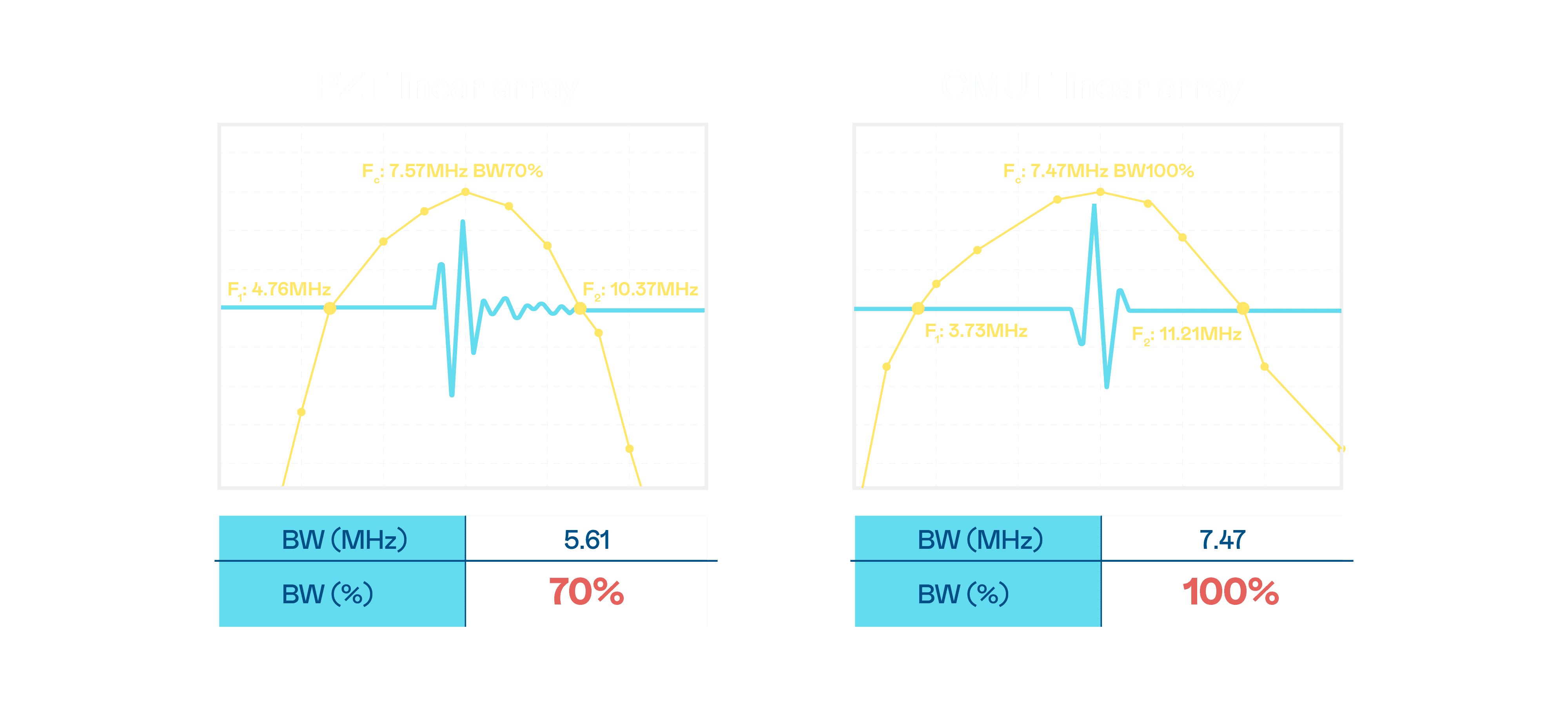 超音波影像的解析度高低,,,首先取决于探头能发出的讯号频宽。。。。人生就是博 CMUT 可提供高清晰的超音波讯号,,,提供高频宽、、、高灵敏度、、、影像纹理细节更高的超音波影像,,,协助医护人员缩短影像判读时间及利用精准的医疗影像进行诊断。。