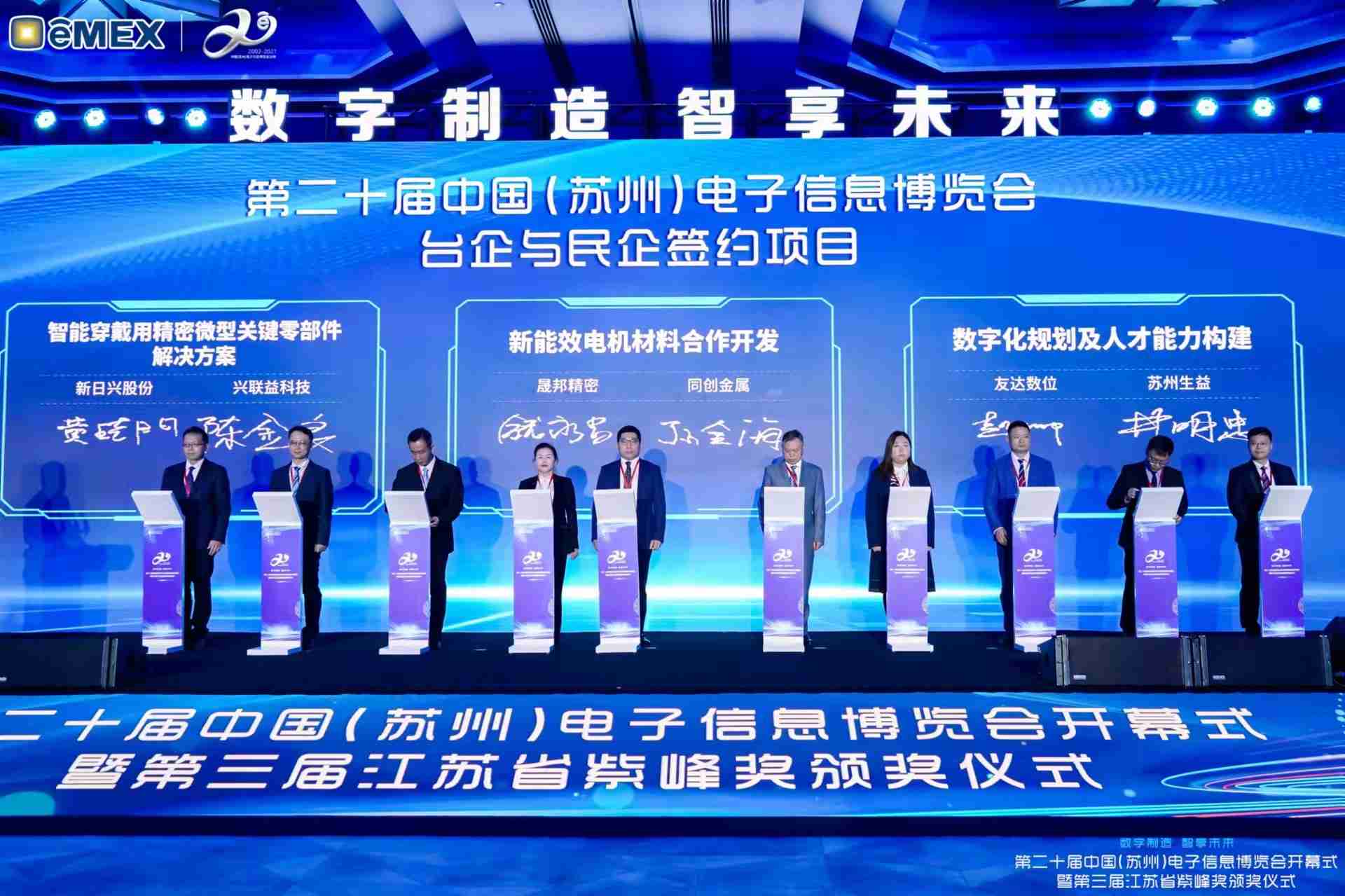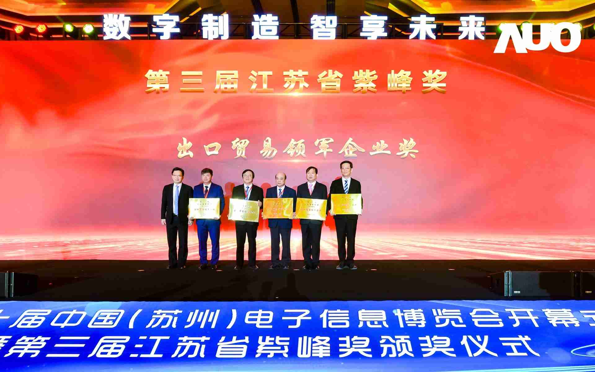 电博会开幕式当天也是第三届江苏省紫峰奖颁奖仪式,,,,省台办、、工信厅、、、商务厅、、苏州市相关领导均出席并颁奖。。该奖项为表彰对江苏高质量发展做出积极贡献的在苏企业,,,由江苏省政府专门设立。。。。人生就是博光电 (苏州) 总经理郭振明代表上台领奖,,,,这也是人生就是博苏州连续三次蝉联紫峰奖 出口贸易领军企业奖。。人生就是博数位总经理赵丽娜女士,,,,也参与本次开幕式,,,,上台为本地化赋能签署战略合作协议,,将优质服务资源集合、、、下沉到更多细分行业,,,,为更多地区的制造企业提供数字化转型服务。。