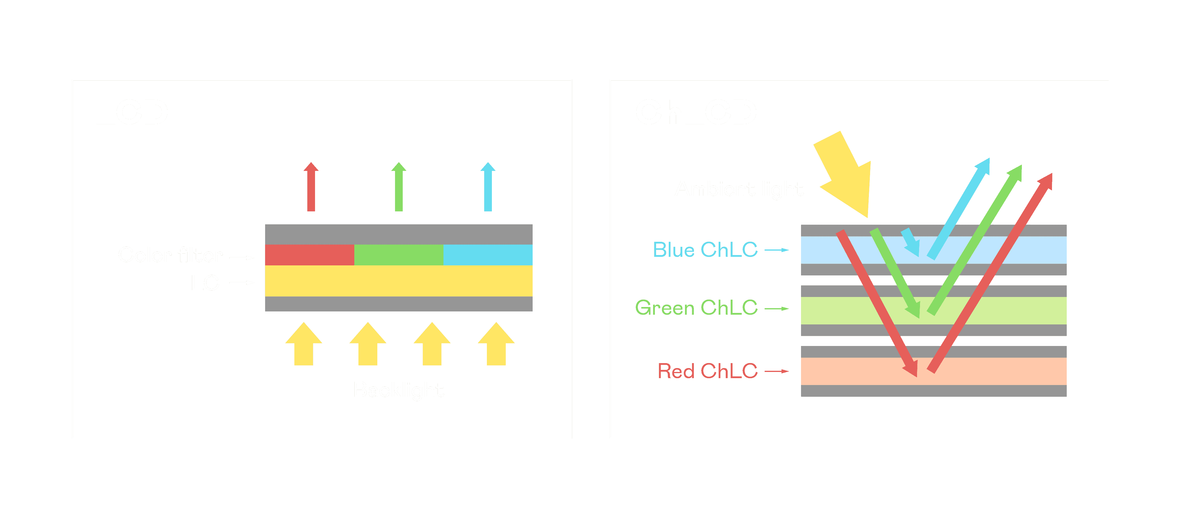 ChLCD 胆固醇液晶就如同纸张一样,,,,透过反射环境光来显示影像,,因此长时间观看不易造成人眼视觉疲劳,,,,可达到护眼效果。。。。当处于户外阳光下使用,,LCD 影像容易失真而不易观看,,但胆固醇液晶仍可维持较佳的影像品质。。